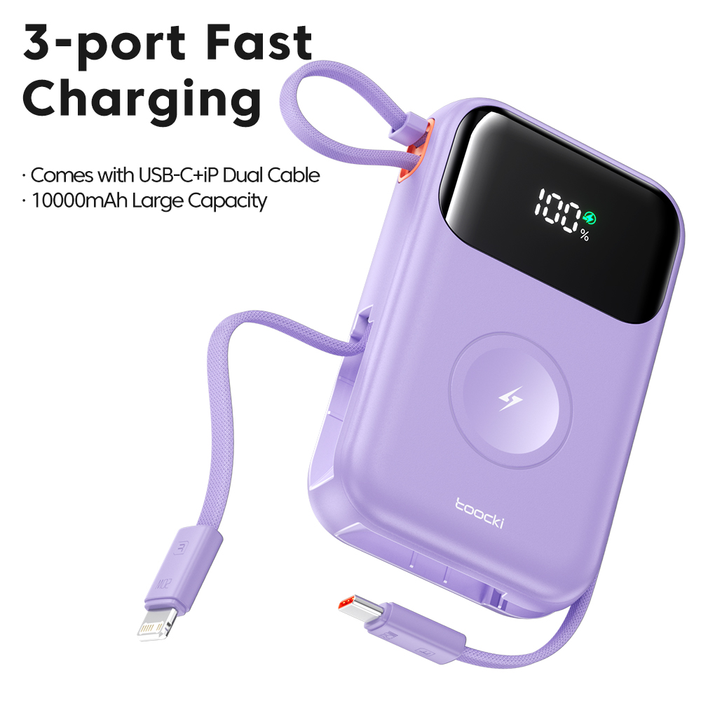 - Built-In Cables: Equipped with a USB-C and Lightning fast-charging cable, this power bank eliminates the need for extra cables. Just grab and go!