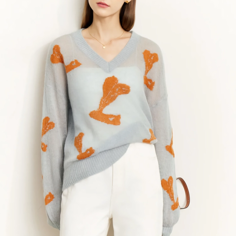 Step into the cooler seasons with style and comfort with our Autumn V-neck Jacquard Loose Mohair Sweater. This sweater is designed to keep you warm and fashionable, perfect for those crisp autumn and winter days. Its V-neck and loose fit offer a relaxed yet elegant look, making it a versatile piece for your wardrobe.