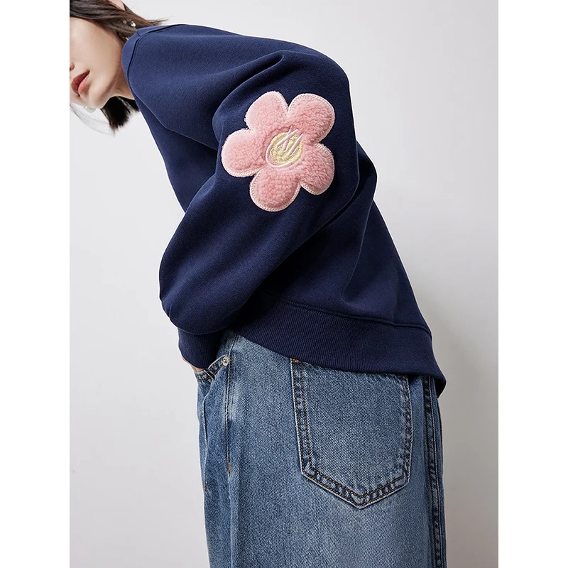 What sets this sweatshirt apart is its unique flower patchwork on the sleeves, adding a touch of femininity and charm to a classic silhouette. The solid pattern makes it versatile and easy to pair with your favorite jeans, skirts, or trousers, making it a staple in your autumn and winter wardrobe.